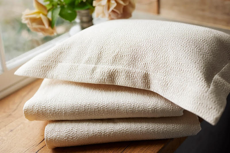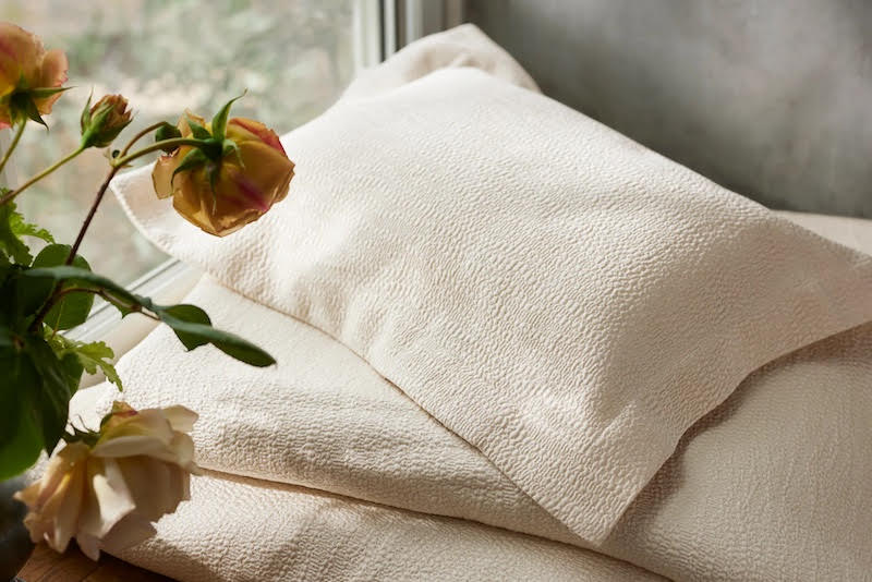 Purists Sumi Cover is made from high-end silk and organic cotton, this jacquard fabric is not only beautiful but also durable. Its natural shades add a touch of elegance to any space, making it the perfect addition to your home. Indulge in the finest quality and all-natural comfort with Sumi. Mitered corners. Duvets/shams are button closure. 65% Organic Cotton / 35% Silk. Jacquard Boutis. Woven in Italy.