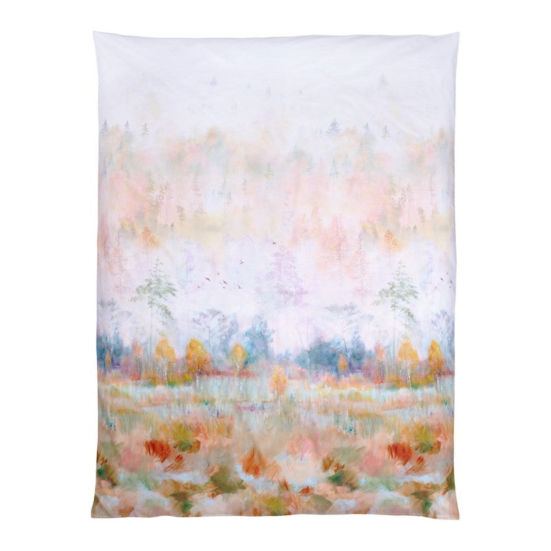 Christian Fischbacher's Aurum's design has delicate wisps of mist float over the treetops, giving the print design a light appearance that fades into brilliant white. Colorful ochres, reds and greens illuminate the trees and grasses. Painted in the in-house atelier, the autumnal atmosphere is printed in Northern Italy on the exclusive and well proven cotton sateen. Zipper Closure. 100% Cotton.