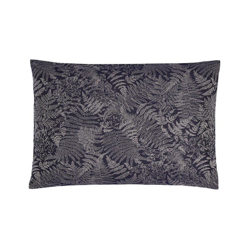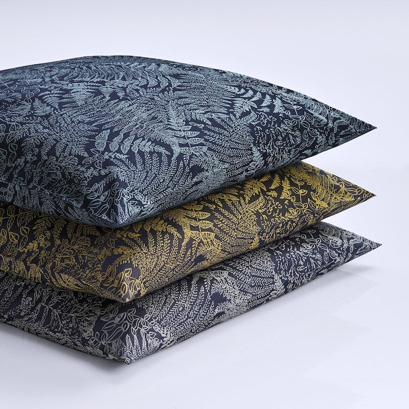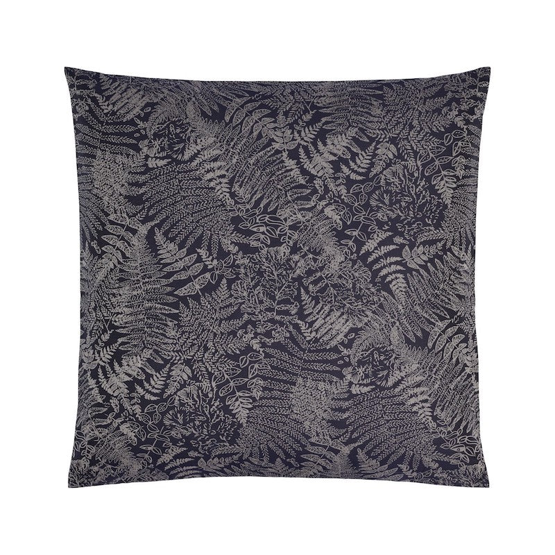 Christian Fischbacher's Farn 305 Light Grey has drawn fern motifs that have been condensed into a fascinating design. The result is a wonderfully iridescent fabric on a dark warp that shines in gold, silver and iridescent light blue and can be used on both sides. The balanced ratio of warp and weft satin gives Fern a pleasantly soft feel. Zipper closure. 100% Cotton.