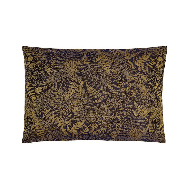 Christian Fischbacher's Farn 363 Gold has drawn fern motifs that have been condensed into a fascinating design. The result is a wonderfully iridescent fabric on a dark warp that shines in gold, silver and iridescent light blue and can be used on both sides. The balanced ratio of warp and weft satin gives Fern a pleasantly soft feel. Zipper closure. 100% Cotton.