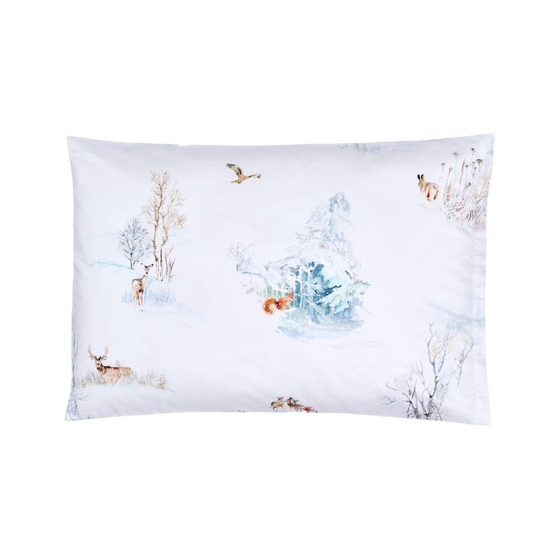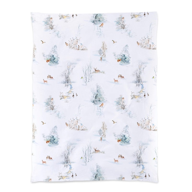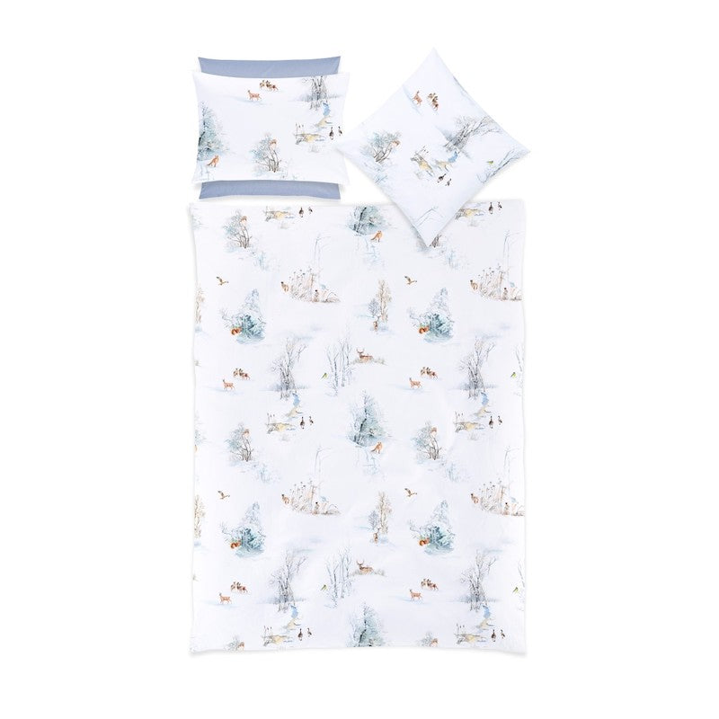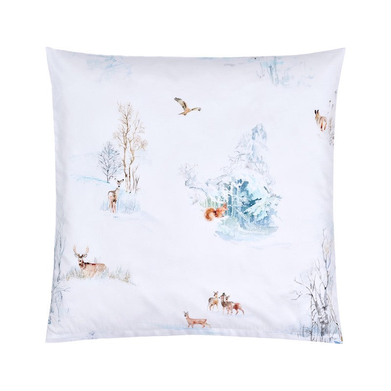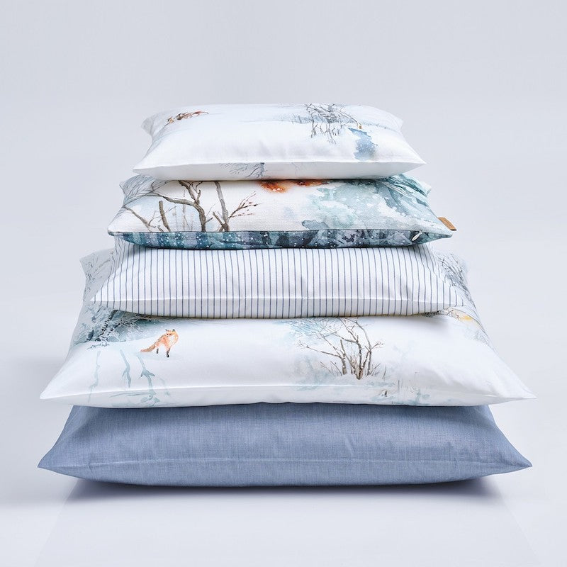 Christian Fischbacher's Finja is an enchanting print design that follows the popular tradition of the Christian Fischbacher handwriting. Fine brushstrokes bring squirrels, snow-covered dwarf birches and the tracks of wild geese in the snow to life. A majestic red kite circles over the winter landscape. Dream-inspiring winter motifs are artistically painted on a white background in soft beige, brown and blue tones. Zipper Closure. 100% Cotton.