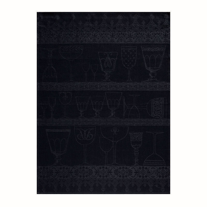 Le Jacquard Francais Cristal in Dark Grey Tea Towels are beautiful 100% linen tea towels. Cristal depicts an open cabinet with three shelves of etched wine glasses on it. Great for drying crystal and fine china. Jacquard woven from 100% Linen. Made in France.