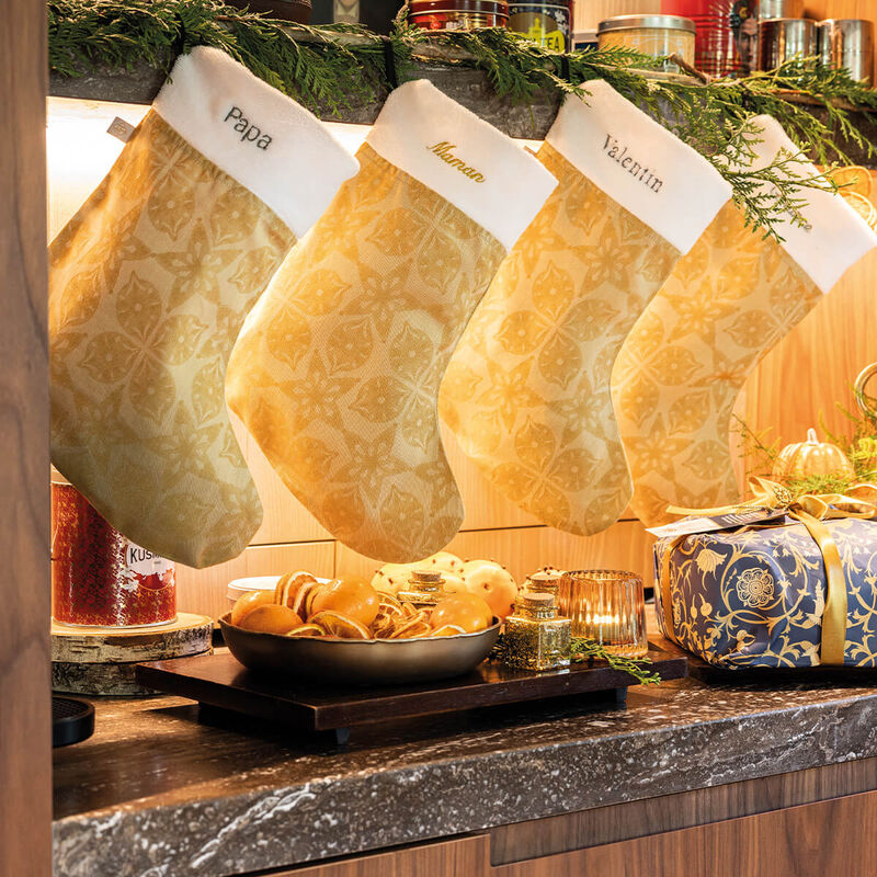 Le Jacquard Francais Feerie Christmas Stockings in Red are pure folkloric magic. The design has garlands and wreaths made up of flowers that were inspired by traditional woodwork. They are so festive with their sparkling trees, stars, and ornaments. A perfect addition for your holiday decor. Cotton hanging loop. Jacquard weaving (color warp and weft). 100% Cotton Combed Yarns (long fibers).Â