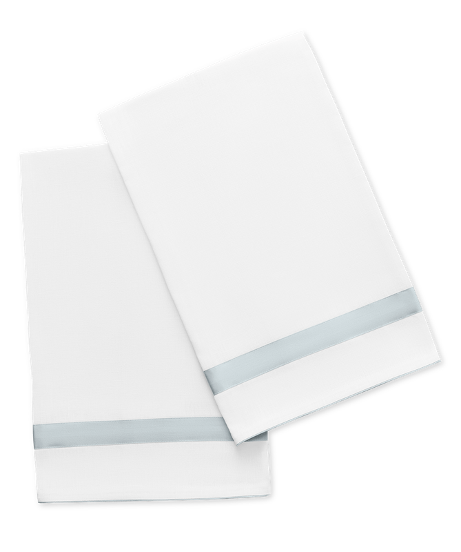 Matouk's Lowell Guest Towels in Pool beloved's design is reimagined as a linen guest towel, where white Valentina linen with Nocturne sateen trim offers a tailored, polished touch. Comes with a complimentary Matouk Gift Box. 100% linen. Made in the Philippines of fabric from Portugal.
