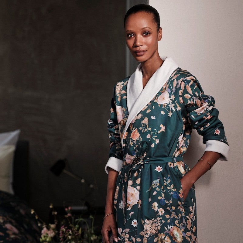 Christian Fischbacher's Fantasia Bathrobe combines the best of two worlds, the pleasant soft feeling of Christian Fischbacher terry bathrobes as well as the exclusive design of the unique satin bedding of Fantasia. The hand-painted motifs are complemented by transparent, shimmering flowers. This combination of traditional art and digital technology gives the design a contemporary character. The vibrant brushstrokes and dark background create depth and take you into a world of fantastic plants. Elegant turn-down collar and side pockets for practical comfort. 100% cotton Satin.