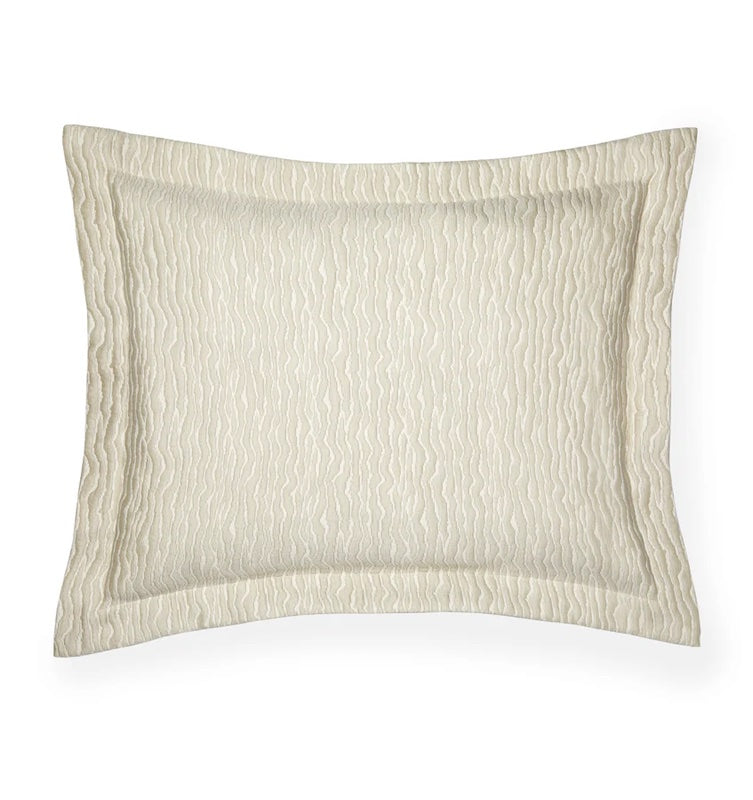 Sferra's Ondate in Dark Khaki is a beautiful reversible collection. It has a beautiful undulating pattern that resembles rain. The soft palette is elegant, soothing and exquisite. It will transform your bed into a rolling landscape which has soothing powers. Perfect for a bedroom. 100% long staple cotton yarn dyed. Plain Hem. Flange on duvet cover is 2 1/2 inches and Sham's flange is 2 inches. Made in Italy.