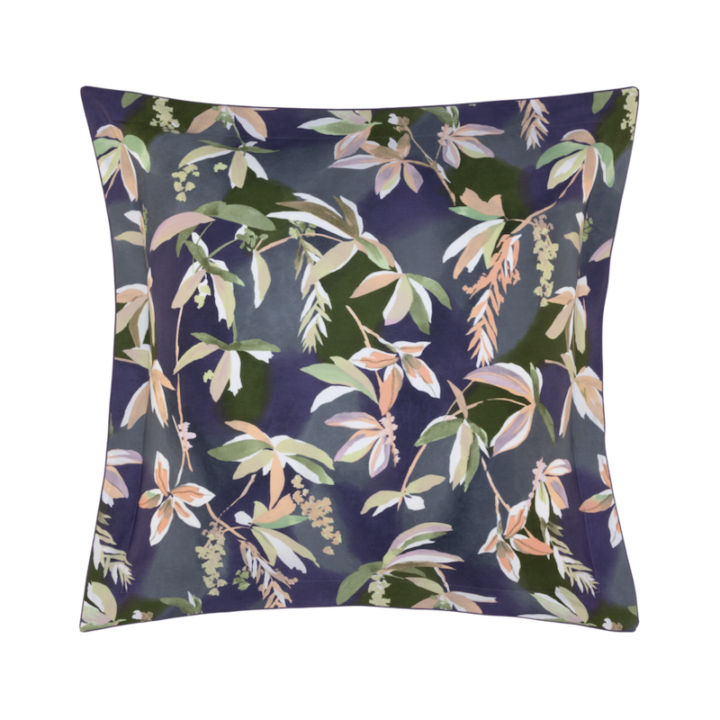 Yves Delorme's Brume Bed Collection is stunning with a design of mysterious vegetation and velvety textures in ink. Printed on 100% long staple combed organic cotton sateen, 300 thread count. Made in France.