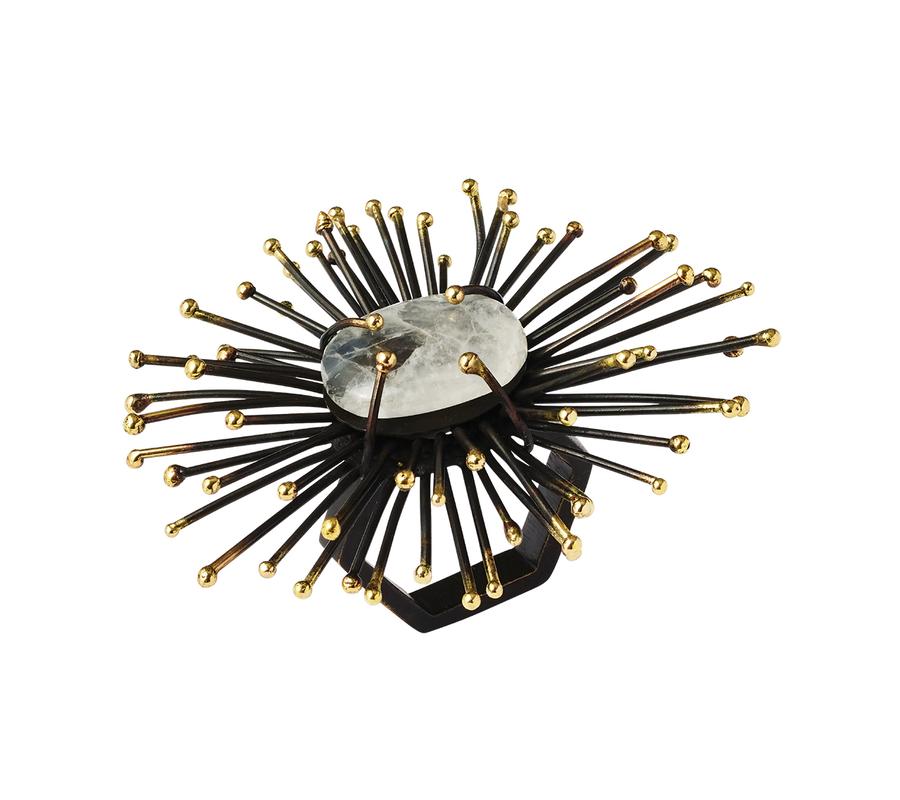 Kim Seybert's Flare Napkin Rings are so eye catching. Never let it be said that a little drama is a bad thing, as in the brass spokes of this napkin ring emanating from a resin center mimicking malachite.